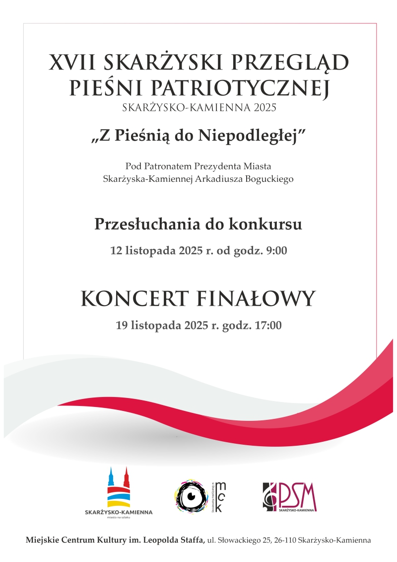 Serdecznie zapraszamy na koncert finałowy XVII Skarżyskiego Przeglądu Pieśni Patriotycznej, który odbędzie się 19 listopada o godz. 17:00. Znajdź na mapieXVII Skarżyski Przegląd Pieśni Patriotycznej - koncert finałowyUdostępnij:
