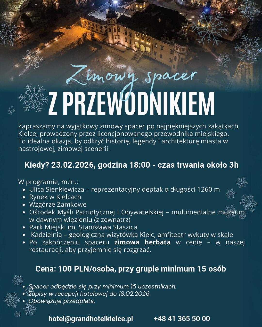 Serdecznie zapraszamy na zimowy spacer z przewodnikiem po Kielcach. Podczas wycieczki zaplanowano zwiedzanie największych atrakcji Kielc (bez wejść do budynków).